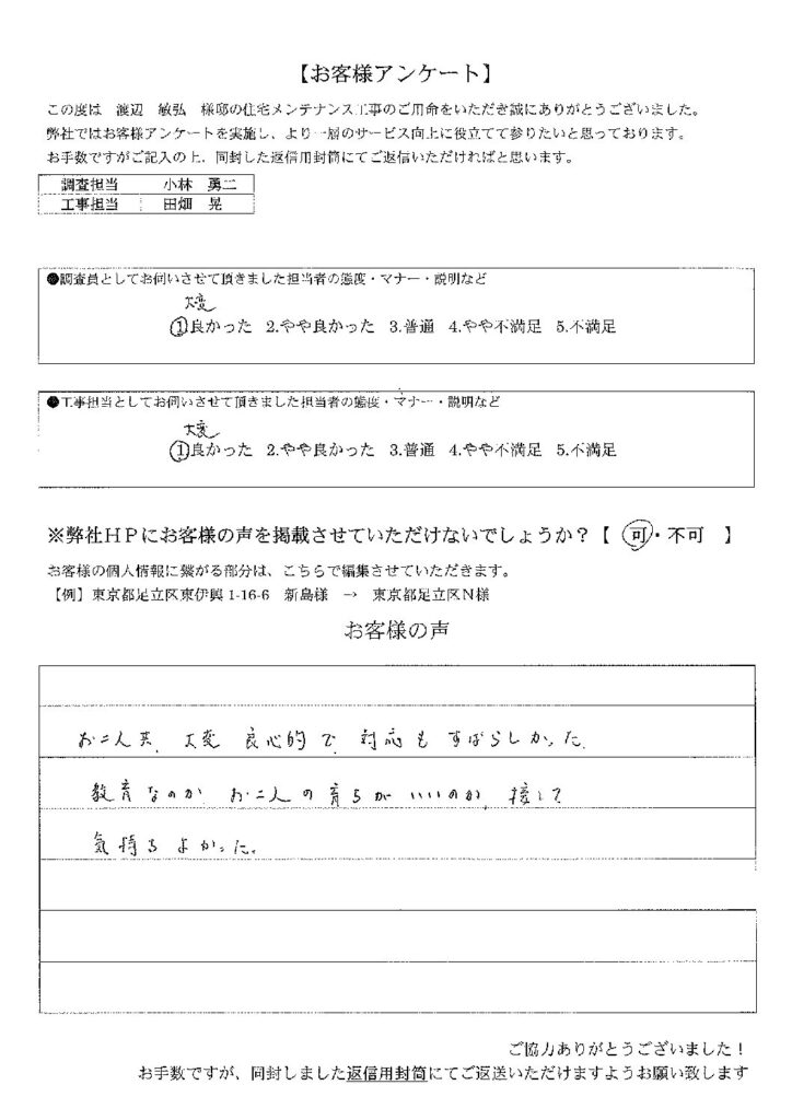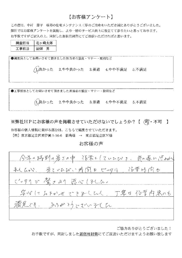 東京都葛飾区K様  調査担当者さま、工事担当者さま、皆様大変丁寧にご対応くださり、作業前・作業中・作業後と常にこちらがわかりやすいご説明をして下さるので安心して作業をお任せする事ができました。 詳しくはこちら