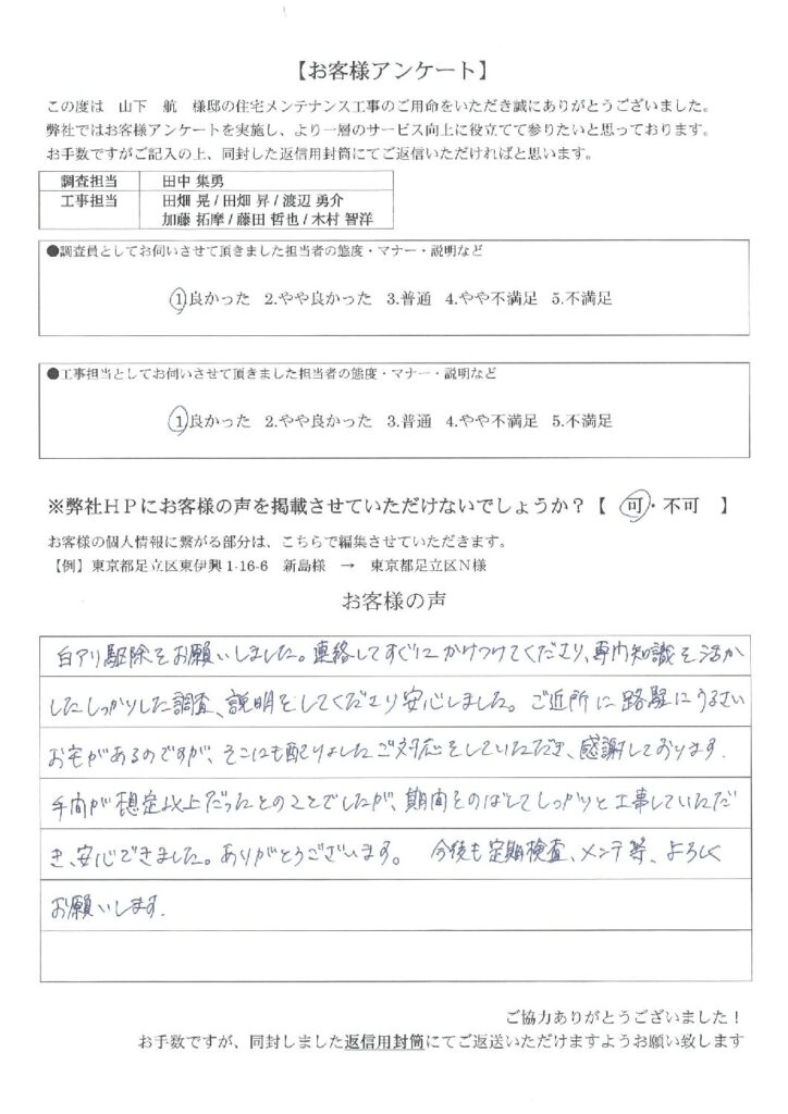 シロアリが出る前に予防として施工依頼しましたが、お願いして本当に良かったと思っています。他社より安いし。