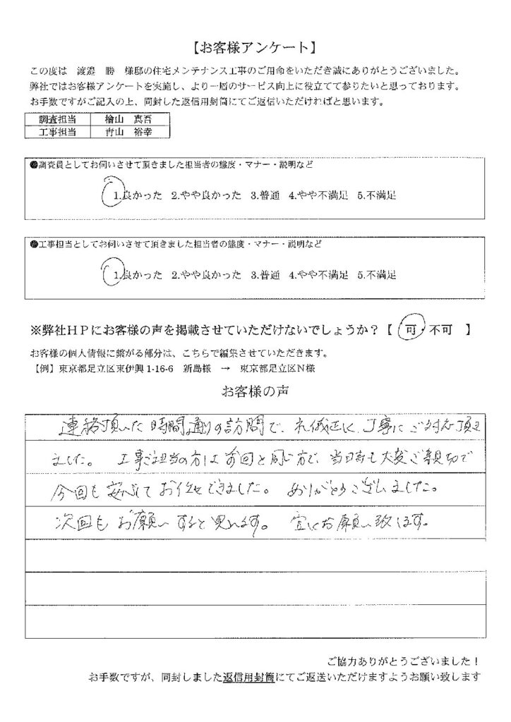 工事担当の方は前回と同じ方で、当時も大変親切で今回も安心してお任せできました、ありがとうございました。