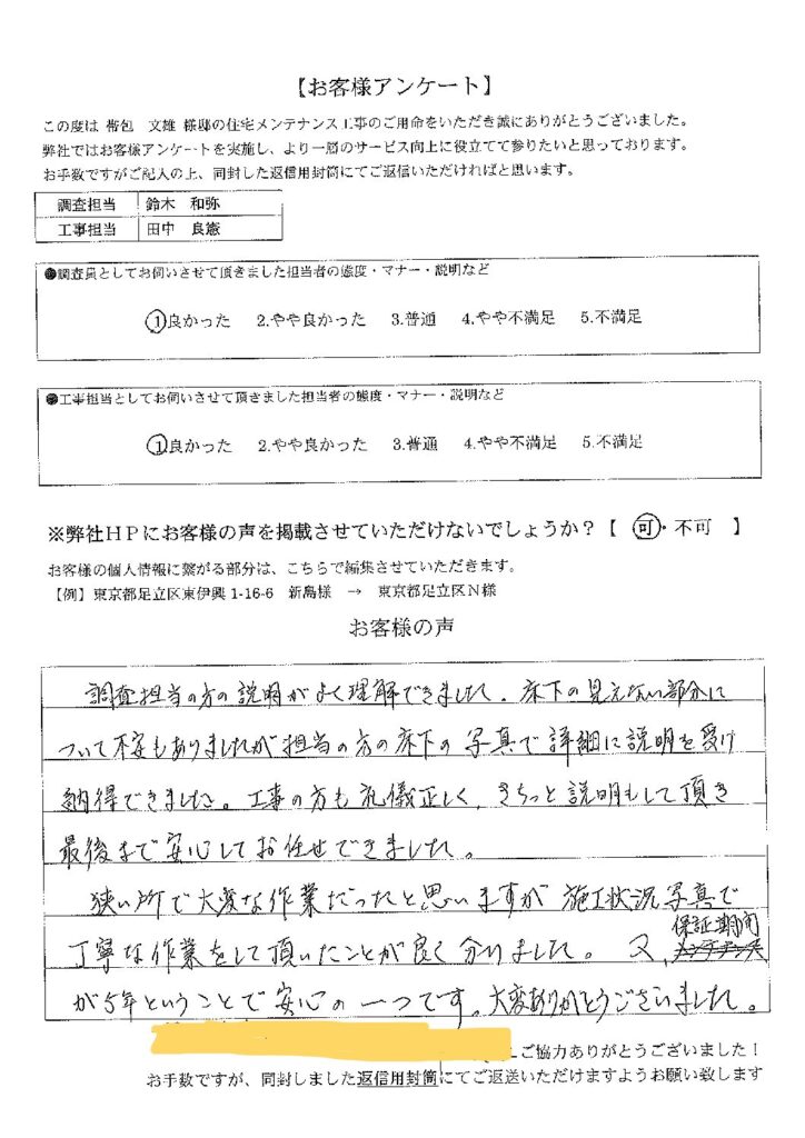 家の下の事でどのようにしているのかと不安もありましたが丁寧に説明もあり、写真付きで家の状況も分かりやすく、安心して工事を終えました。