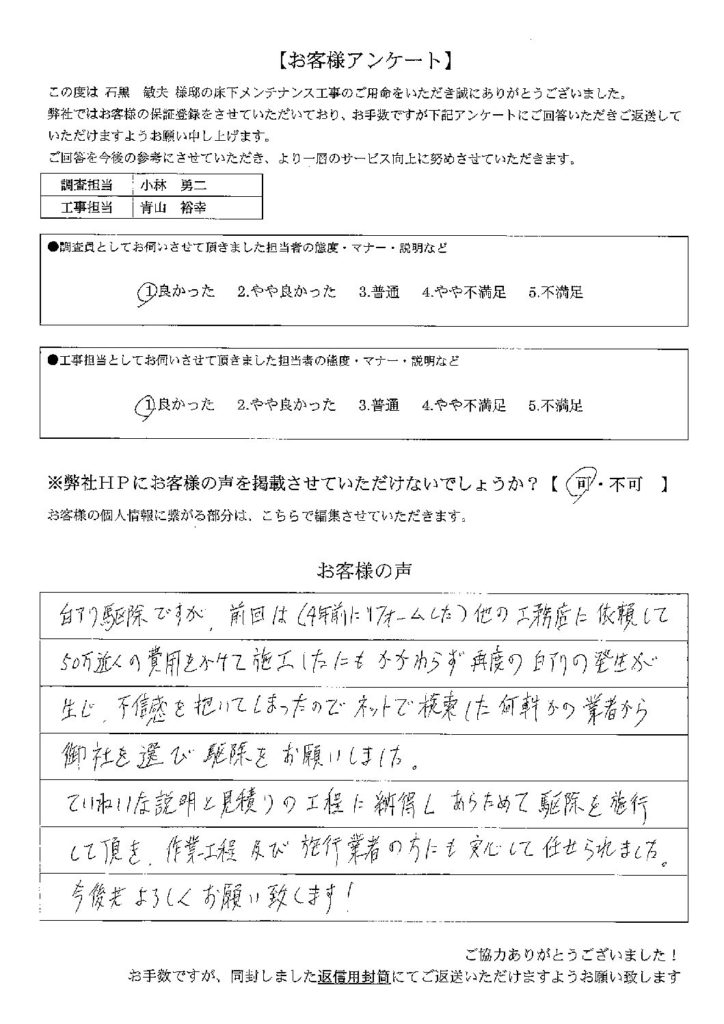 丁寧な説明と見積もりの工程に納得し、あらためて駆除を施工していただき、作業工程及び施工業者の方にも安心して任せられました。今後ともよろしくお願い致します。