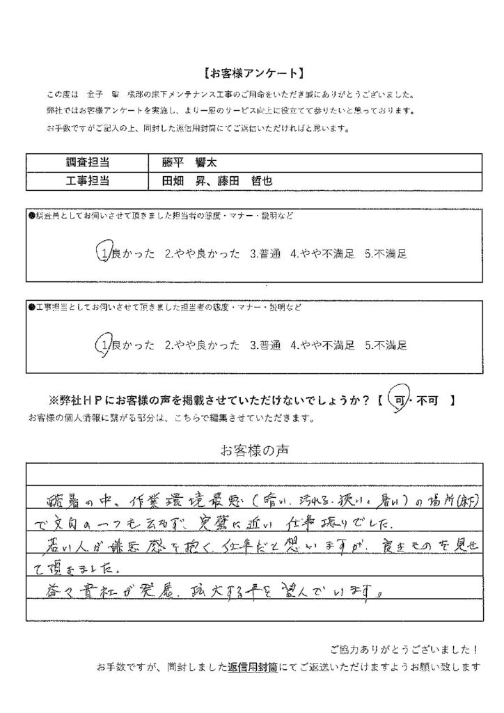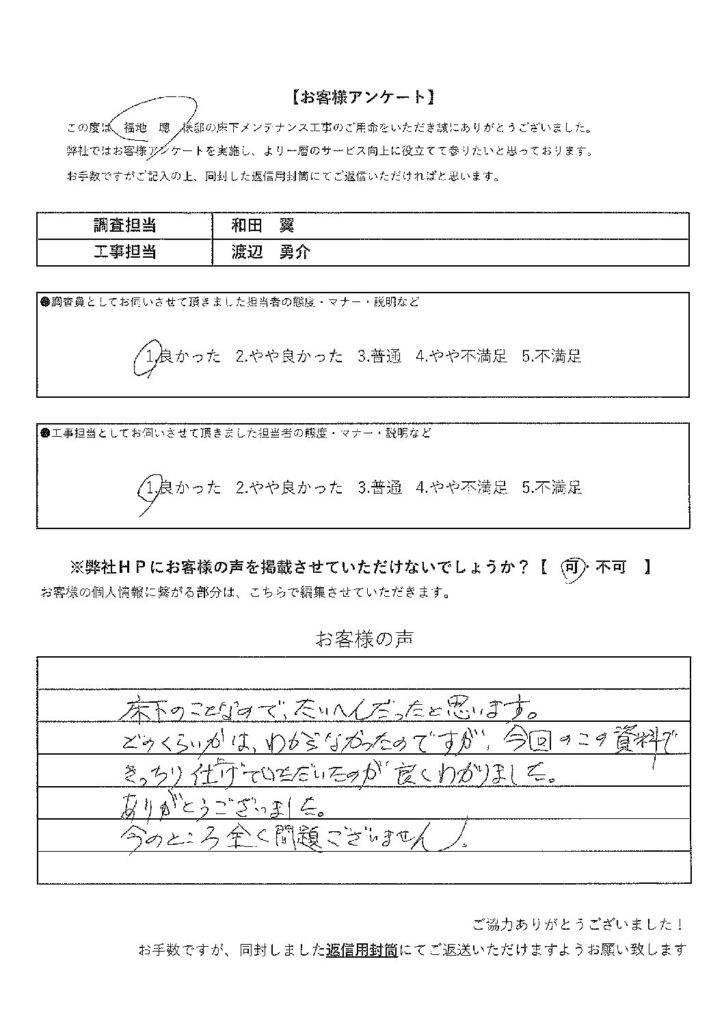 施工前の床下の状態(ビデオで確認)、施工後の写真から依頼して良かったです。