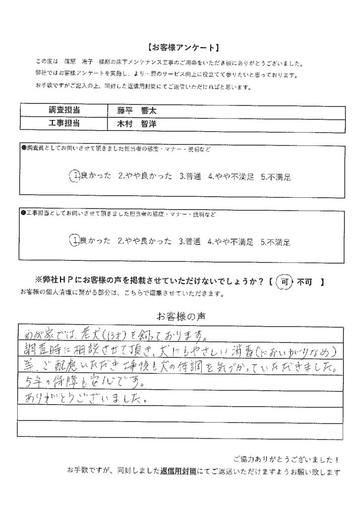 調査時に相談させて頂き、犬にもやさしい消毒(においが少なめ)等、ご配慮いただき工事後も犬の体調を気遣っていただきました。