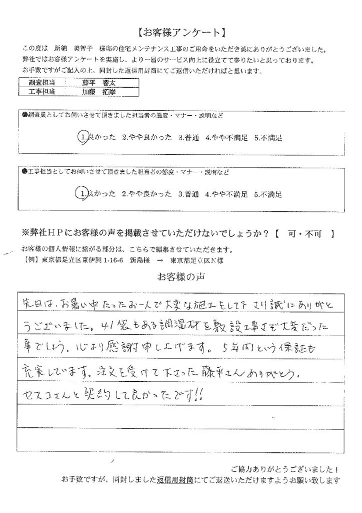 先日は暑い中たったお一人で大変な施工をして下さり誠にありがとうございました。41袋もある調湿材を敷設工事さぞ大変だったことでしょう。心より感謝申し上げます。