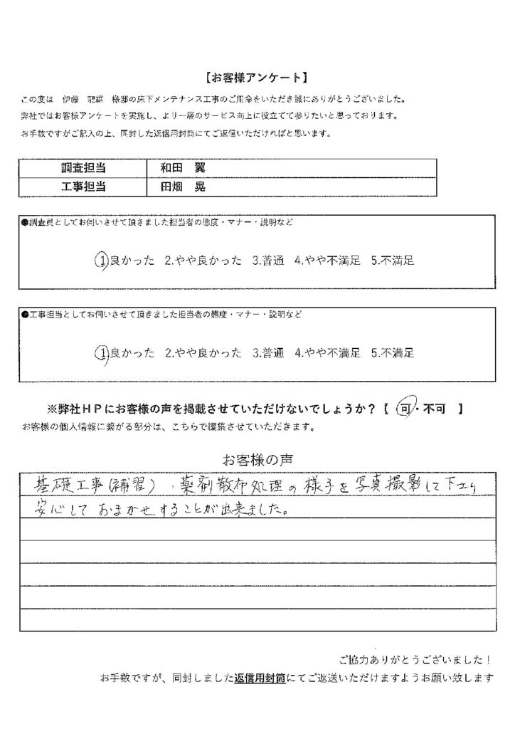 基礎工事(補修)、薬剤散布処理の様子を写真撮影してくださり、安心しておまかせする事ができました。